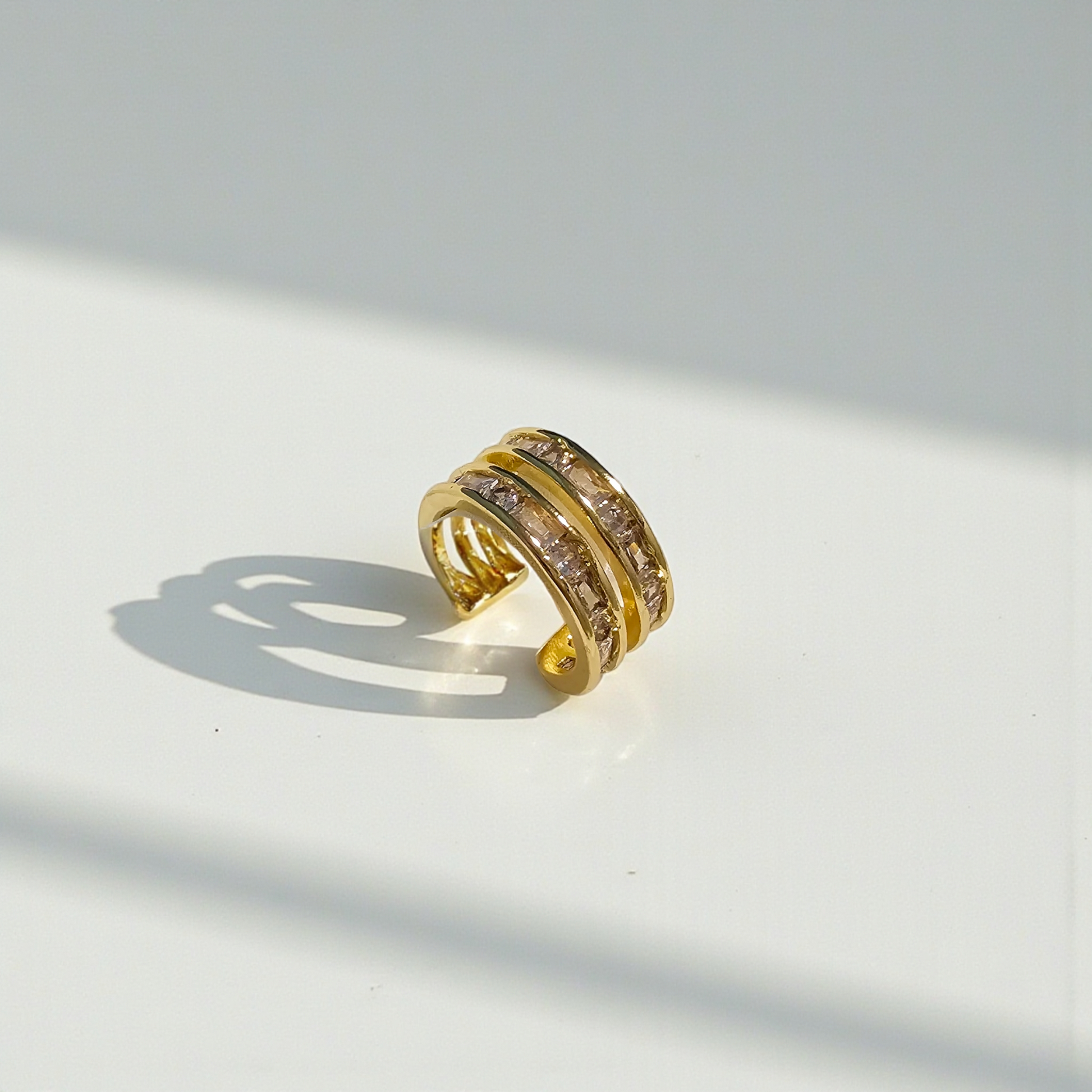 Dale un toque moderno a tu oreja sin necesidad de perforación. Ear cuff tono dorado con brillantes.